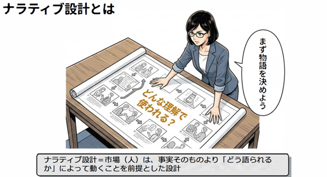 そのために必要なのがナラティブ設計です。商品そのものを語るのではなく、それによって得られる未来を先に描いて見せる。