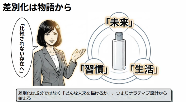 成分や処方、機能など、商品そのものがどれだけ優れていても、それがどんな暮らしにつながり、どんな未来をつくる商品なのかが理解されなければ、価値は十分に理解されません。