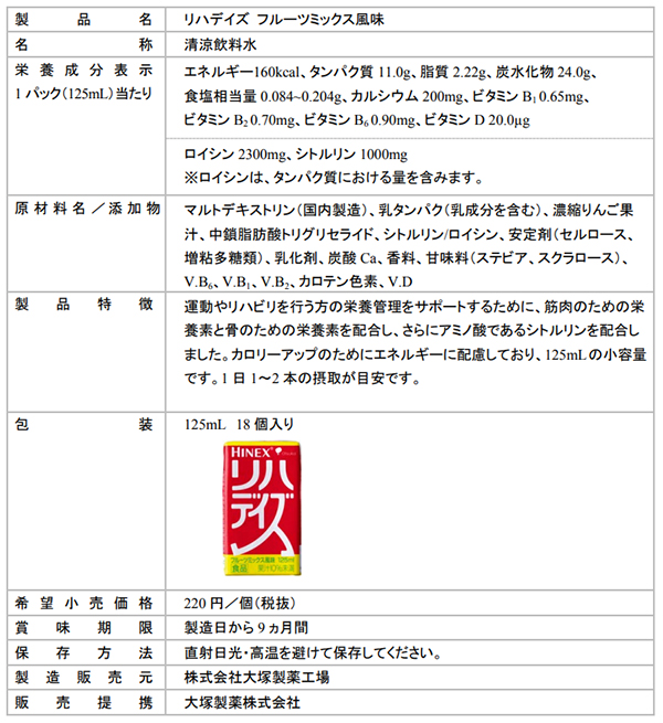 株式会社大塚製薬工場は、運動やリハビリテーション(以下「リハビリ」)に必要な栄養を考えたカラダづくりサポート飲料「リハデイズ」の新風味として、フルーツミックス風味を新発売しました。 運動やリハビリ時……