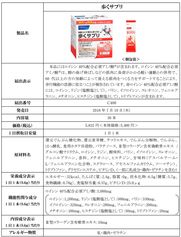 株式会社ファンケルは 7 月 19 日(木)から、いつまでも元気に歩きたい方におすすめの機能性表示食品「歩くサプリ」(30 日分:5,832 円<税込>)を通信販売と直営店舗で新しく発売し……