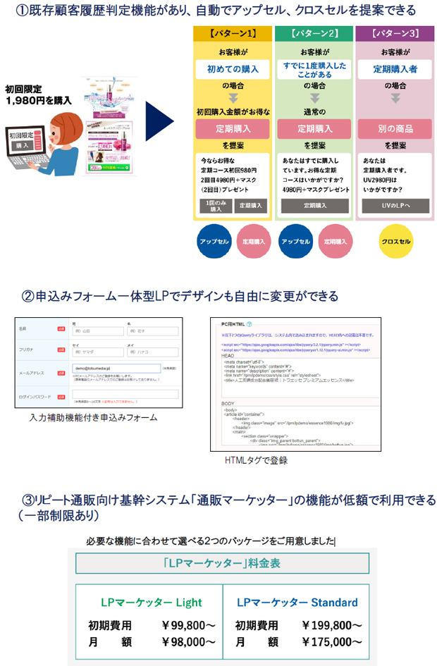 株式会社東通メディアは、リピート通販向けの広告LPフォーム「LPマーケッター」の提供を開始する。 LPマーケッターではお客様情報を入力すると顧客データベースから自動で既存顧客判定を行い、適切なアップ……