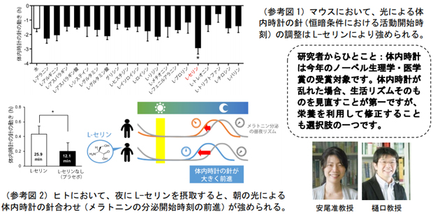 九州大学大学院農学研究院の安尾しのぶ准教授と芸術工学研究院の樋口重和教授は、株式会社ファンケルとの共同研究により、アミノ酸の一種である L-セリンを摂取すると、光による体内時計の針合わせが強められるこ……