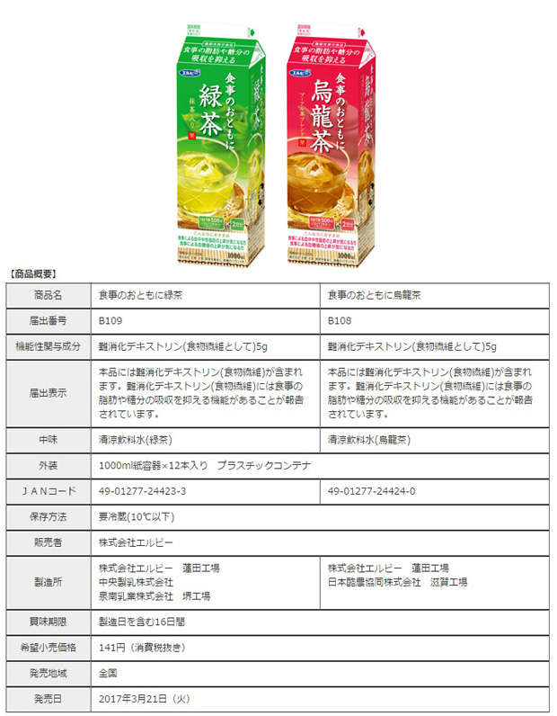 株式会社エルビーは、脂肪や糖分の吸収を抑えるチルド飲料の機能性表示食品「食事のおともに緑茶」「食事のおともに烏龍茶」(各1000ml 紙容器)を3月21日(火)より、全国で新発売します。 「機能性表……