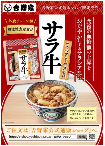株式会社吉野家は、2017 年 3 月 6 日より外食チェーンとして初めてとなる機能性表示食品、「サラ牛」(商品名:サラシア入り牛丼の具、以下サラ牛)を吉野家公式通販ショップで販売します。 この度……