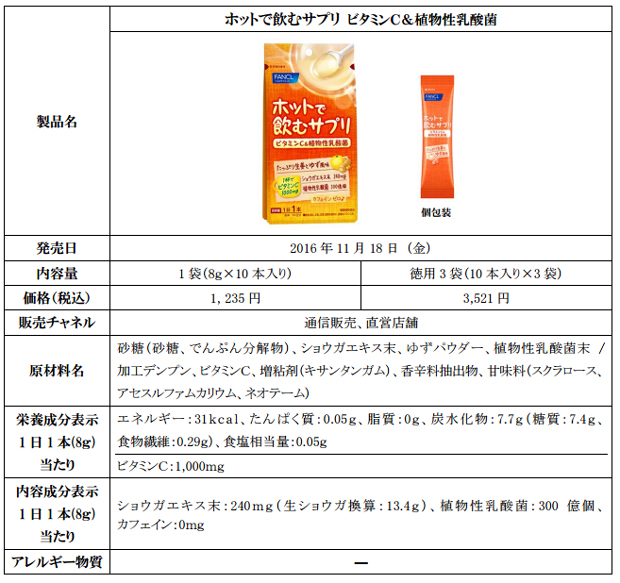 株式会社ファンケルヘルスサイエンスは 2016 年 11 月 18 日(金)から、お湯に溶かして飲むことで体を温め、冬に負けない体づくりをサポートするサプリメント「ホットで飲むサプリ ビタミンC&植物……