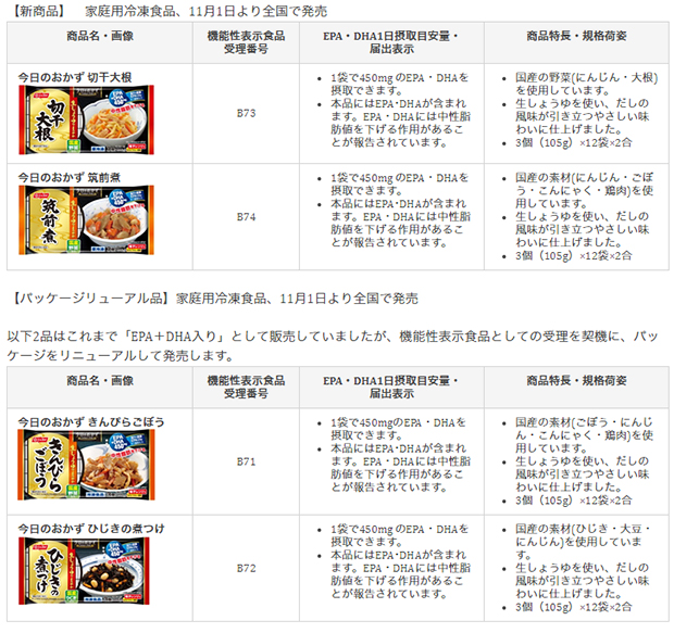日本水産株式会社では、機能性素材EPA(エイコサペンタエン酸)を使用したブランド「海から、健康EPA life(エパライフ)」より、機能性表示食品(注1)として受理された家庭用冷凍食品4品を11月1日……