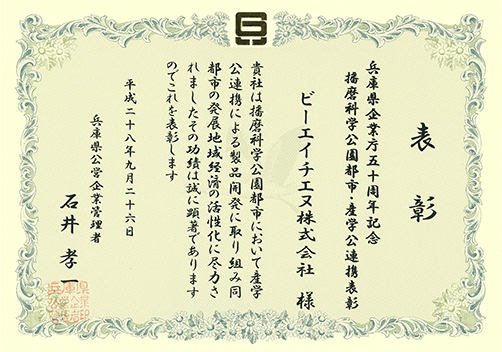 ビーエイチエヌ株式会社は、兵庫県企業庁の発足50周年を記念し、播磨科学公園都市内に立地する企業の中から産学公連携を実践する表彰企業に選ばれました。 ◆表彰理由 ビーエイチエヌと兵庫県立大学環境人間学……