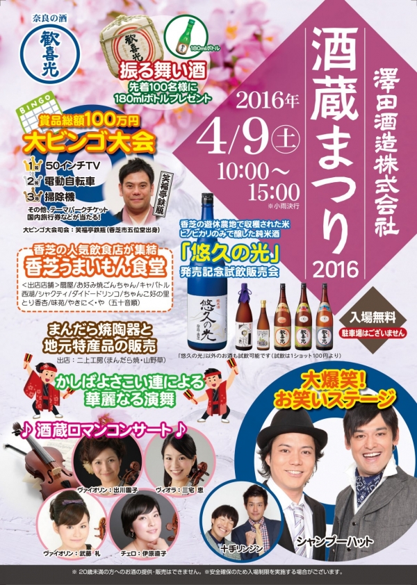 澤田酒造株式会社は奈良県香芝市の本社にて、第1回【酒蔵まつり2016】を開催します。日頃から【歓喜光】をご愛飲いただいておりますお客様はもちろん、お仕事等でお世話になっております関係各位の皆様、そして……