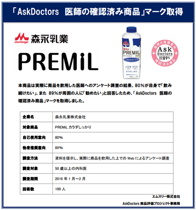 森永乳業株式会社の「PREMiL カラダしっかり」は、エムスリー株式会社提供の「AskDoctors 評価サービス」による評価の結果、“ミルク"で初めて(*1)「AskDoctors 医師……