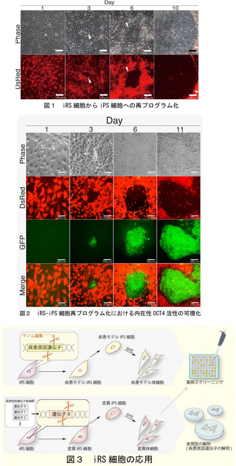 新たに樹立した、ヒトiRS細胞は、ヒト体細胞からiPS細胞へ再プログラム化される中間段階にある幹細胞株である。特性として、1)培養条件を変えることで、iPS細胞への再プログラム化を効率よく再開する、2……