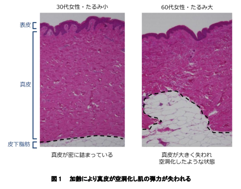 株式会社資生堂は、加齢に伴い肌内部の真皮が空洞化して脂肪に置き換わっていること(図 1)、更に真皮が空洞化している人ほど肌の弾力が失われ、外見上も顔が大きくたるんでいることを発見しました。また併せて、……