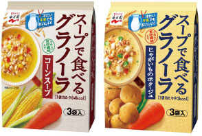 株式会社 永谷園は、最近の健康意識の高まりや素材のおいしさから人気の高い グラノーラを使ったスープ「スープで食べるグラノーラ コーンスープ」「同 じゃがいものポタージュ」(3 袋入、税抜280 円)……
