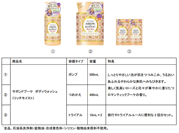 コーセーコスメポート株式会社は、100%「純せっけん」のボディ用洗浄料『サボンドブーケ』に、オーガニックオイルを配合し、うるおいのある素肌に導く「リッチモイスト」(全 1 品目 3 品種、ノープリント……