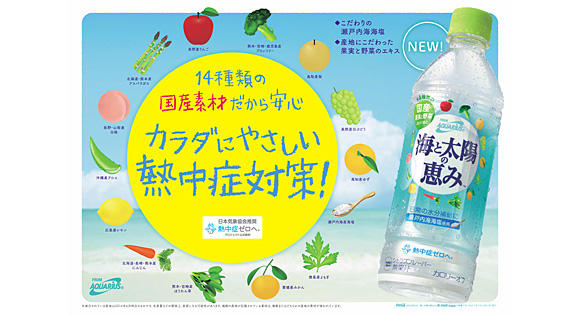 日本コカ・コーラ株式会社は、14種類の国産の果実と野菜のエキスなどでつくったカラダにやさしい水分補給飲料「海と太陽の恵みfrom AQUARIUS」を6月16日(月)、全国で発売します。瀬戸内海の海塩……
