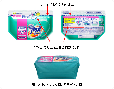 花王株式会社と凸版印刷株式会社は、2014年5月29日、環境とユニバーサルデザインに配慮した、粉末タイプの衣料用洗剤「アタック高活性バイオEX つめかえパック」の開発により、公益社団法人日本包装技術協……