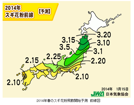 一般財団法人日本気象協会は、2014年1月15日(水)に全国・都道府県別の2014年春の花粉(スギ・ヒノキ、北海道はシラカバ)飛散予測(第3報)を発表します。また、詳細な情報を、「2014年春の花粉総……