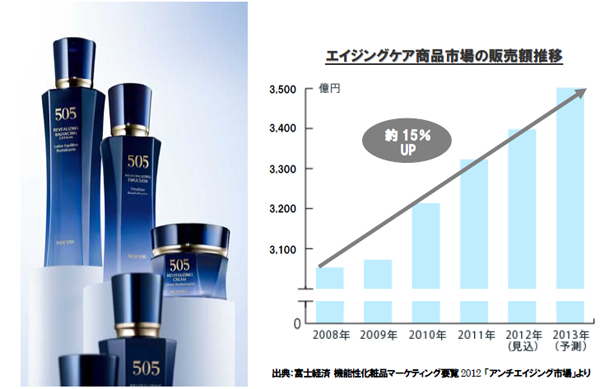 ノエビアは、1993 年誕生の基幹エイジングケア※1 シリーズ「ノエビア505 薬用シリーズ」を2013 年10 月5 日にリニューアル発売します。2011 年、化粧品の効能範囲の改正により、新効能「……