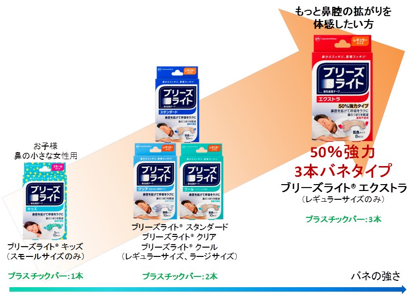 グラクソ・スミスクライン株式会社が販売する鼻孔拡張テープ「ブリーズライト®」は、従来のプラスチックバー2本タイプと比べて鼻腔を拡げる力が50%強力※1になった、3本タイプの「ブリーズライト&r……