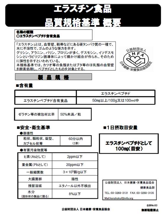 平成24年3月30日(金)付で、63番目のJHFA品質規格基準である「エラスチン食品 品質規格基準」を公示しました。これにより、4月2日(月)からJHFAマークの表示許可申請の受付を開始します。◆……