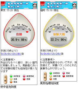 一般財団法人日本気象協会(本社:東京都豊島区, 会長:松尾 道彦)は、携帯公式サイト「気象協会晴曇雨」で2010年6月30日(水)から、現在地周辺の熱中症危険度や風邪危険度を簡単にチェックできる新コ……