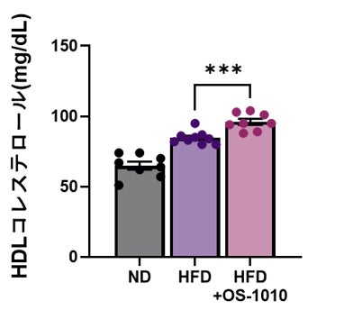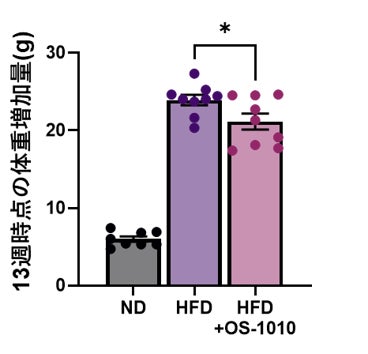 HFD:高脂肪食を与えた群 HFD+OS-1010:高脂肪食と植物性乳酸菌OS-1010™加熱殺菌体を与えた群 |