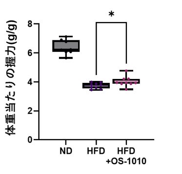 ●植物性乳酸菌OS-1010™の摂取が、筋力低下の抑制、エネルギー産生効率の向上による抗肥満効果、肝機能改善効果を発揮した可能性が示唆された。