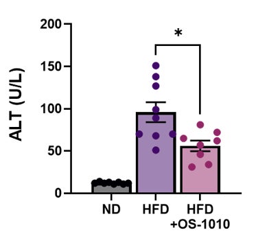 マウスを、①通常食を与えた群(ND)、②高脂肪食を与えた群(HFD)、③高脂肪食と植物性乳酸菌OS-1010™加熱殺菌体を与えた群(HFD+OS-1010)の3つに分け、13週間にわたり経口摂取させて生理的効果を検証しました。その結果、HFD+OS-1010群ではHFD群と比べて、13週経過時点の体重増加量が有意に抑制されました(図1-1)。また、握力においても有意な結果を得られたことから、植物性乳酸菌OS-1010™加熱殺菌体を摂取することで高脂肪食の摂取により誘発される握力の低下を抑制できることが示されました(図1-2)。血液検査では、HFD+OS-1010群がHFD群と比べて血中HDLコレステロールの増加および肝機能障害マーカーALTの有意な低下が認められました(図2-1, 2-2)。