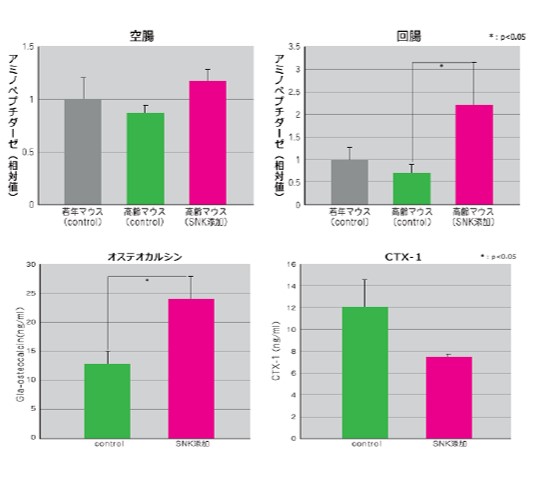通常食を与えた 6 週齢の若年マウス群(対照)と、70 週齢の高齢マウス群(対照)に加え、 SNK 投与した70 週齢の高齢マウス(SNK 添加)を12 週間飼育後、空腸および回腸から粘膜を回収し、アミノペプチダーゼ活性を測定した。その結果、空腸、回腸のどちらも若年マウスと比較し、SNK を添加した高齢マウスは若年マウスよりもアミノペプチダーゼ活性が上昇した。 また、通常食の高齢マウスにおいては、アミノペプチダーゼ活性は低下していた。