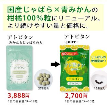 2025年11月20日(木) 青みかんとじゃばら100%の“pure”処方へ 青みかんとじゃばら100%の「アトピタン~pure~(ピュア)」として新たに生まれ変わりました。 |