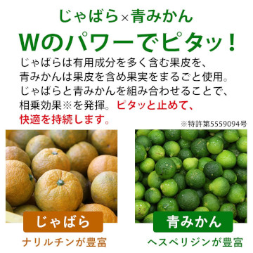青みかんに含まれるヘスペリジンは、体のめぐりをサポートし、じゃばらの働きを補うだけでなく、成分の吸収性を高める役割も担っています(特許番号:5559094号)。