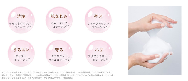 洗顔中のうるおいと肌触りの良さを追求し、まるでシルクのようになめらかで、きめ細かな濃密泡を実現。肌の汚れを落とす「モイストウォッシュコラーゲン(※6)」や、肌の角質層のすみずみまでうるおいを与える「モイストコラーゲン(※7)」など6種のコラーゲン(※1)を配合した濃密泡で、洗顔中もリッチなうるおいを体感いただけます。