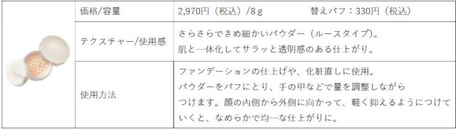サラサラと軽やかな粉質が肌に心地よく広がり、汗や皮脂によるくずれを防止。重ねても厚塗り感のない仕上がりで、澄んだ透明美肌をキープ。強い日差しが続く季節にも、快適さと美しさを両立する“夏のお守りパウダー”です。