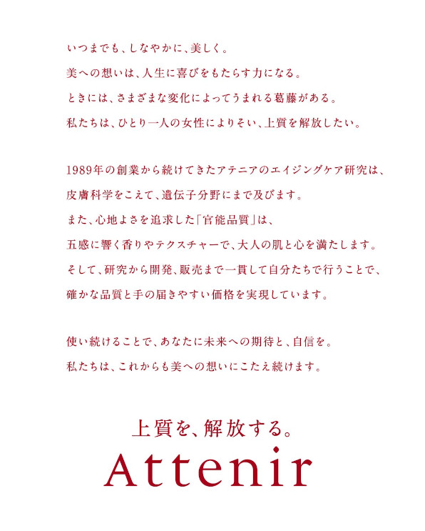 女性の本音に寄り添い、「品質」と「使い心地」にこだわって、確かな美しさを「続けられる価格」で提供するブランド。1989 年の創業以来続くエイジングケア*研究から生まれる「確かな品質」と、五感に響く香りや触り心地など「官能品質」の追求、製造から販売までを一貫して自社で行うことにより実現する「適正価格」で、大人女性の肌も心も解き放つ上質な体験を提供します。